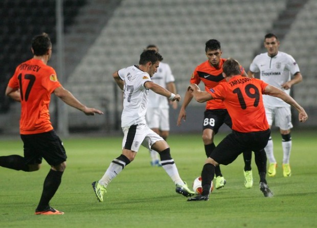 Οι φιλοξενούμενοι προηγήθηκαν στο 50 με πέναλτι του Τσάνα για μαρκάρισμα του Κατσουράνη, αλλά όπως φάνηκε και από τον τηλεοπτικό φακό ο Έλληνας διεθνής δεν βρήκε τον σκόρερ. Στο 57 ο ΠΑΟΚ είχε δοκάρι σε σουτ του Λάζαρ. Η ισοφάρισε ήρθε στο 75 με προβολή του Αθανασιάδη και στο 92 ο Βούκιτς, ο οποίος είχε μπει αλλαγή στο 85, λύτρωσε την ελληνική ομάδα. Η Σαχτιόρ ολοκλήρωσε το ματς με δέκα παίκτες λόγω αποβολής του Ποριβάεφ στο 87.
