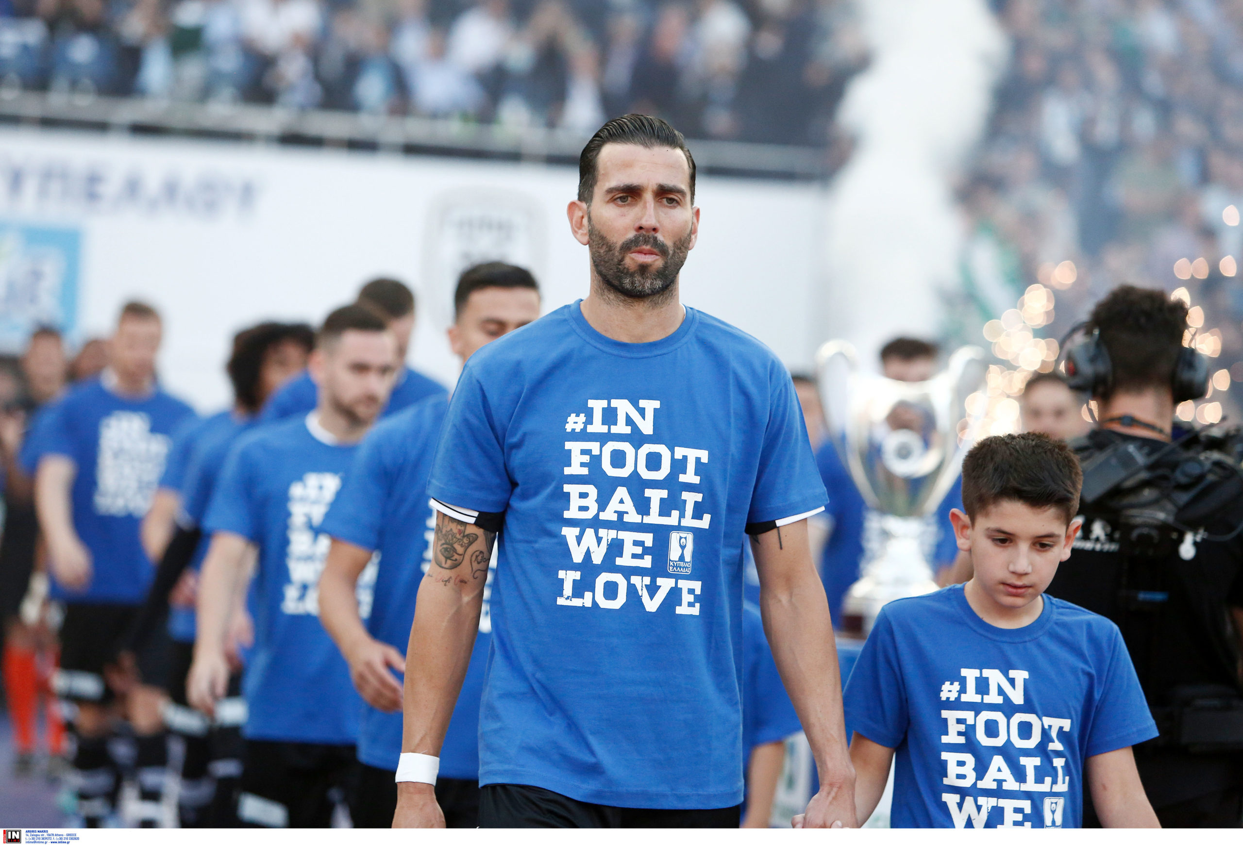 Με 32 λεπτά καθυστέρηση ξεκίνησε ο τελικός Κυπέλλου Ελλάδας. Λίγο νωρίτερα, οι παίκτες του Παναθηναϊκού και του ΠΑΟΚ είχαν βγει στον αγωνιστικό χώρο φορώντας μπλουζάκια στα οποία αναγραφόταν ένα ηχηρό μήνυμα.