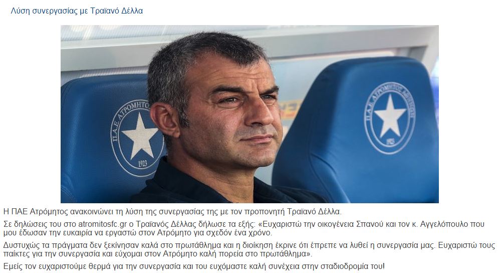 Τη λύση της συνεργασίας της με τον προπονητή, Τραϊανό Δέλλα, ανακοίνωσε η ΠΑΕ Ατρόμητος.