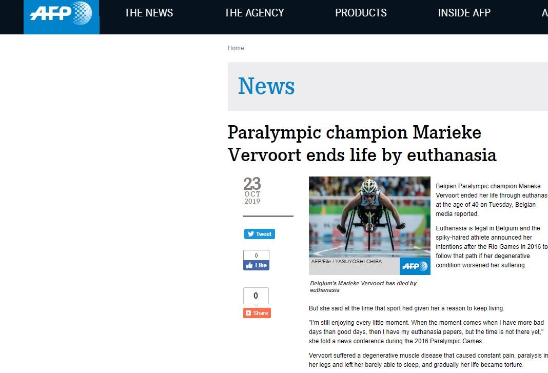 Η Παραολυμπιονίκης Μαρίκε Βερβόορτ έδωσε τέλος στη ζωή της με ευθανασία στα 40 της χρόνια την Τρίτη, όπως μεταδίδει το AFP, επικαλούμενο βελγικά ΜΜΕ.