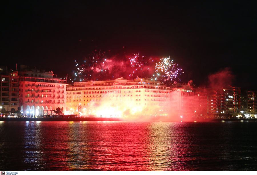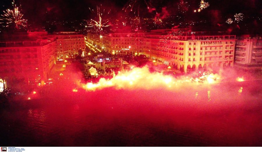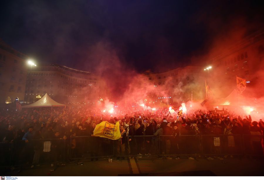 Οι παίκτες του ποδοσφαίρου και του μπάσκετ, που αγωνίζονται τη φετινή σεζόν με τα χρώματα του Άρη, γνώρισαν την αποθέωση από τον κόσμο και η πλατεία πήρε… φωτιά μόλις το ρολόι έδειξε 19:14, καθώς το 1914 είναι το έτος ίδρυσης του συλλόγου. Τότε, επικράτησε χαμός με εκατοντάδες καπνογόνα και βεγγαλικά να φωτίζουν τον ουρανό της Θεσσαλονίκης.