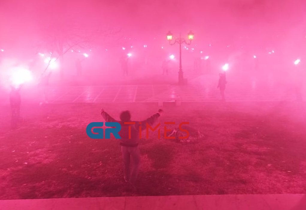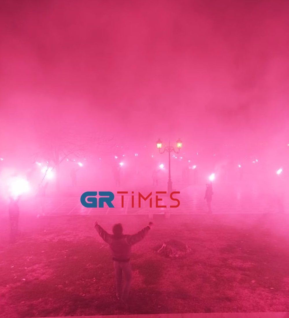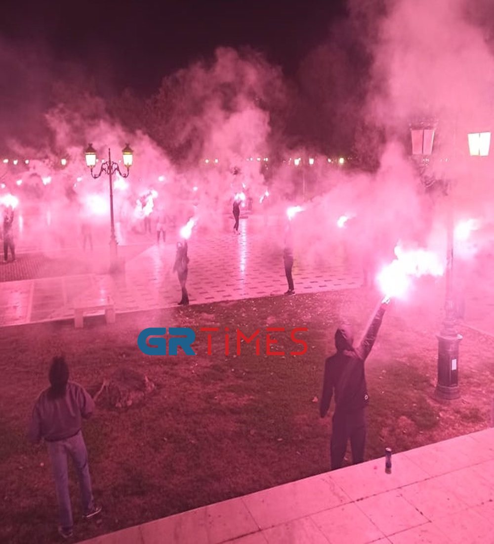 Οπαδοί του Ημίθεου κρατώντας πυρσούς στα χέρια και φωνάζοντας συνθήματα της αγαπημένης τους ομάδας, έκαναν τη νύχτα – μέρα σε ένα από τα κεντρικότερα σημεία της Θεσσαλονίκης και συγκεκριμένα το άγαλμα Βενιζέλου, όπου πολύ κοντά βρίσκεται ο σύνδεσμος της Αυτόνομης Θύρας 10.