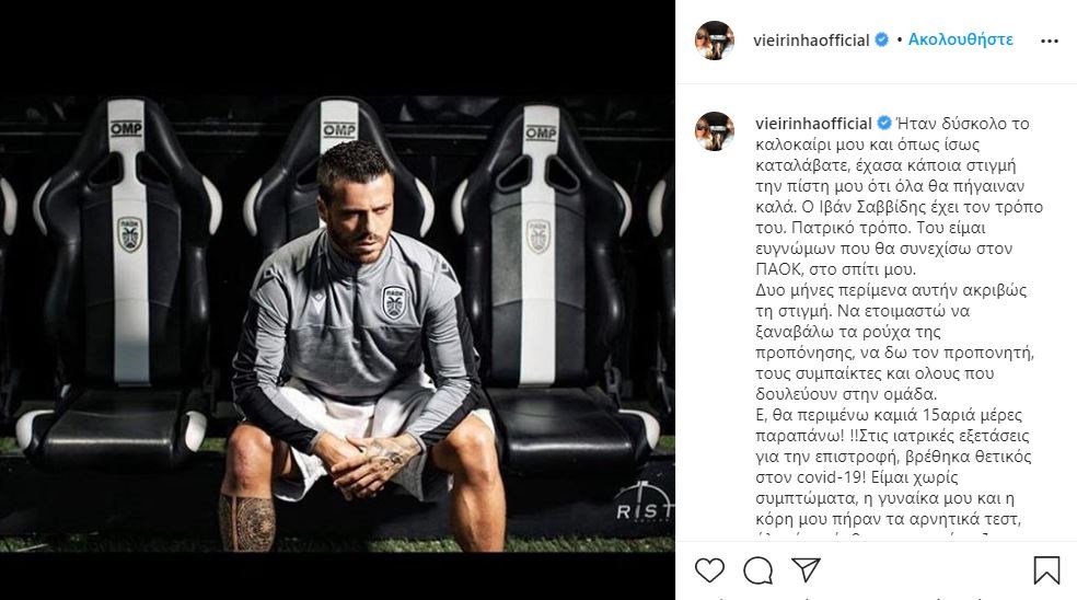 Όπως έγραψε στην ανάρτησή του: “Ήταν δύσκολο το καλοκαίρι μου και όπως ίσως καταλάβατε, έχασα κάποια στιγμή την πίστη μου ότι όλα θα πήγαιναν καλά. Ο Ιβάν Σαββίδης έχει τον τρόπο του. Πατρικό τρόπο. Του είμαι ευγνώμων που θα συνεχίσω στον ΠΑΟΚ, στο σπίτι μου. Δυο μήνες περίμενα αυτήν ακριβώς τη στιγμή. Να ετοιμαστώ να ξαναβάλω τα ρούχα της προπόνησης, να δω τον προπονητή, τους συμπαίκτες και όλους που δουλεύουν στην ομάδα. Ε, θα περιμένω καμιά 15αριά μέρες παραπάνω! !!Στις ιατρικές εξετάσεις για την επιστροφή, βρέθηκα θετικός στον covid-19! Είμαι χωρίς συμπτώματα, η γυναίκα μου και η κόρη μου πήραν τα αρνητικά τεστ, όλοι όσοι ήρθαν σε επαφή μαζί μου τις προηγούμενες μέρες υποβλήθηκαν σε τεστ και τα αποτελέσματά τους ήταν αρνητικά. Ξεκινάω με μια μικρή άδεια την νέα μου χρονιά στον ΠΑΟΚ. Σορρυ κόουτς! Ανυπομονώ να σας ξαναδώ όλους! Προστατέψτε τους εαυτούς σας, φορέστε μάσκες και σύντομα θα είμαστε όλοι μαζί…stay safe.