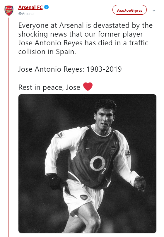 «Άπαντες στην Άρσεναλ είναι συντετριμμένοι από την σοκαριστική είδηση ότι ο πρώην ποδοσφαιριστής μας Χοσέ Αντόνιο Ρέγες σκοτώθηκε σε αυτοκινητιστικό δυστύχημα στην Ισπανία. Αναπαύσου εν ειρήνη Χοσέ», έγραψαν χαρακτηριστικά στην ανάρτησή τους στα social media οι Λονδρέζοι.