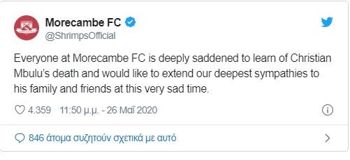 Θρήνος στο αγγλικό ποδόσφαιρο καθώς πέθανε ο κεντρικός αμυντικός της Μόρκαμ, Κριστιάν Εμπουλού. Ήταν μόλις 23 ετών. Τον θάνατό του επιβεβαίωσε η ομάδα της αγγλικής League Two. Η αιτία του θανάτου του δεν έγινε γνωστή.