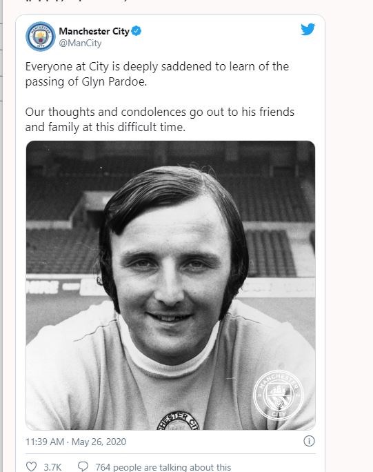 Η Μάντσεστερ Σίτι εξέφρασε τα συλλυπητήρια της για τον θάνατο του Γκλιν Πάρντο, ο οποίος έφυγε χθες από τη ζωή σε ηλικία 73 ετών. Ο Πάρντο έπαιξε από την ηλικία των 15 ετών στην ανδρική ομάδα της Μάντσεστερ Σίτι και παραμένει έως σήμερα ο νεαρότερος σε ηλικία παίκτης, που φόρεσε τη φανέλα της πρώτης ομάδας των «πολιτών». Ο Πάρντο σε όλη την καριέρα του, από το 1962 έως το 1976, αγωνίστηκε με τη φανέλα της Σίτι και ήταν μέλος της ομάδας, που κατέκτησε το πρωτάθλημα του 1968, ενώ πέτυχε το νικητήριο γκολ στον τελικό του Λιγκ Καπ το 1970.