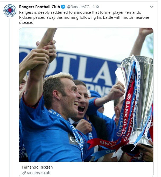 Ο Φερνάντο Ρίκσεν πέθανε σήμερα το πρωί. Ο πρώην ποδοσφαιριστής έχασε τη μάχη που έδινε με τη νόσο των κινητικών νευρώνων σε ηλικία 43 ετών.