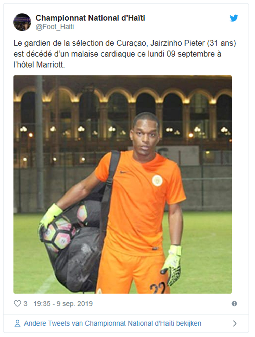 Νεκρός βρέθηκε στο δωμάτιο του ξενοδοχείου όπου διέμενε μαζί με την υπόλοιπη αποστολή, ο Ζαρζίνιο Πίτερ, αναπληρωματικός τερματοφύλακας της εθνικής ομάδας ποδοσφαίρου του Κουρασάο. Όπως ανακοινώθηκε από τις τοπικές αρχές, οι συνθήκες του θανάτου παραμένουν άγνωστες, ωστόσο σύμφωνα με τον υπουργό αθλητισμού της Αϊτής, Εντγουϊν Τσαρλς, ο 31χρονος Πίτερ αντιμετώπιζε προβλήματα με την καρδιά του.