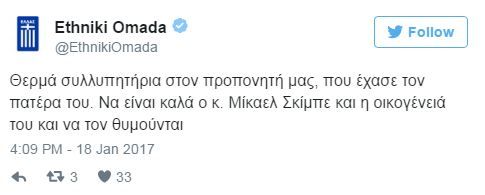«Η Προσωρινή Διοικούσα Επιτροπή της Ε.Π.Ο. και οι εργαζόμενοι στην Ομοσπονδία, εκφράζουν τα θερμά τους συλλυπητήρια προς τον κ. Μίκαελ Σκίμπε, ο πατέρας του οποίου απεβίωσε σε ηλικία 88 ετών».