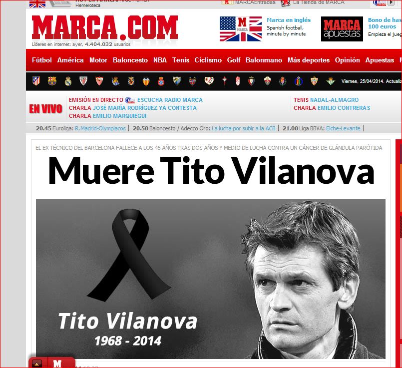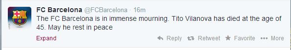 «Ο ποδοσφαιρικός σύλλογος της Μπαρτσελόνα είναι σε βαθύ πένθος. Ο Τίτο Βιλανόβα πέθανε στην ηλικία των 45 ετών. Ας αναπαυθεί εν ειρήνη.», αναφέρει το μήνυμα της ισπανικής ομάδας στο Twitter.