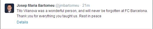 Ο Πρόεδρος της Μπαρτσελόνα, Josep Maria Bartomeu, εξέφρασε τα συλλυπητήρια του στον επίσημο λογαριασμό του στο Twitter, για τον θάνατο του Τίτο Βιλανόβα