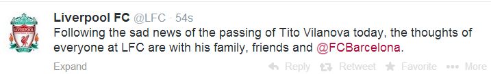 «Μετά τη θλιβερή είδηση του θανάτου του Τίτο Βιλανόβα, οι σκέψεις όλων μας στη Λίβερπουλ είναι στην οικογένειά του, τους φίλους του και την Μπαρτσελόνα».