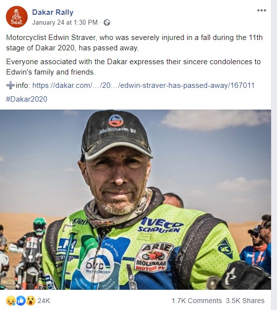 Το ράλι Ντακάρ ανακοίνωσε ότι ο Ολλανδός αναβάτης Έντβιν Στράβερ πέθανε.