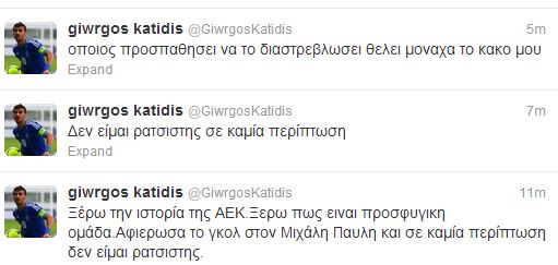 Πριν από λίγο ο νεαρός ποδοσφαιριστής της ΑΕΚ έδωσε την απάντηση – ερμηνεία του χαιρετισμού του, που ξεσήκωσε κύμα αντιδράσεων. Ο Κατίδης δήλωσε ότι ο χαιρετισμός του δεν είναι ρατσιστικός και ότι γνωρίζει την ιστορία της ΑΕΚ.