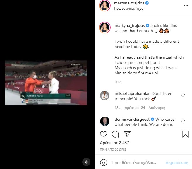 Η 32χρονη, η οποία κατέκτησε το Ευρωπαϊκό Πρωτάθλημα το 2015, ανέφερε σε ανάρτησή της στο instagram ότι είναι μια χαρά και ότι εκείνη ζήτησε από τον προπονητή της να κάνει ό,τι έκανε. Πόσταρε το εν λόγω βίντεο και σχολίασε ότι όσα έκανε ο προπονητής της μάλλον δεν ήταν αρκετά καθώς έχασε.