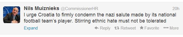 “Η Κροατία πρέπει να καταδικάσει απερίφραστα το χαιρετισμό του ποδοσφαιριστή της εθνικής της ομάδας. Η υποκίνηση εθνικού μίσους δεν μπορεί να γίνεται ανεκτή” έγραψε σε μήνυμά του στο twitter ο κ. Μουίζνιεκς.