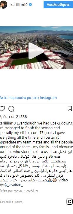 Ο Ιρανός ανέφερε:«Αν και είχαμε πάνω και κάτω, τελειώσαμε τη σεζόν και σκόραρα 17 τέρματα. Έδωσα τα πάντα, κάθε στιγμή, και σίγουρα εκτιμώ τους συμπαίκτες μου και τους ανθρώπους δίπλα στην ομάδα, την οικογένειά μου και τους φιλάθλους που μας συμπαραστάθηκαν»