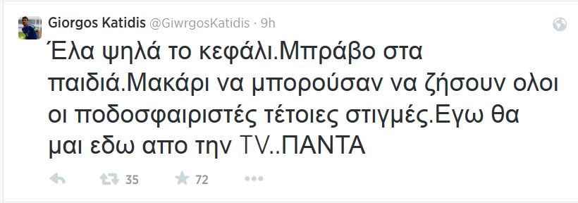 Ο Γ. Κατίδης έγραψε: «Έλα ψηλά το κεφάλι. Μπράβο στα παιδιά. Μακάρι να μπορούσαν να ζήσουν όλοι οι ποδοσφαιριστές τέτοιες στιγμές. Εγώ θα΄ μαι εδώ από την TV. Πάντα».