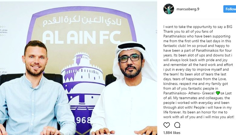 Υπερήφανος για την τετραετία που πέρασε στον Παναθηναϊκό δήλωσε ο Μάρκους Μπεργκ, στο αποχαιρετιστήριο μήνυμά του προς τους φίλους των «πρασίνων». Ο Σουηδός επιθετικός ανήρτησε στο instagram φωτογραφία από την υπογραφή του συμβολαίου του με την Αλ Αΐν και από κάτω αναφέρθηκε στη θητεία του, αλλά και την επεισοδιακή αποχώρησή του από το «τριφύλλι».