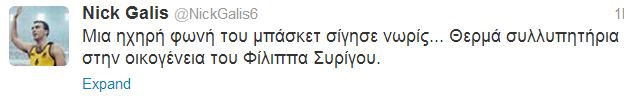 «Μία ηχηρή φωνή του μπάσκετ σίγησε νωρίς», έγραψε στο twitter ο Νίκος Γκάλης αναφερόμενος στον θάνατο του Φίλιππου Συρίγου.