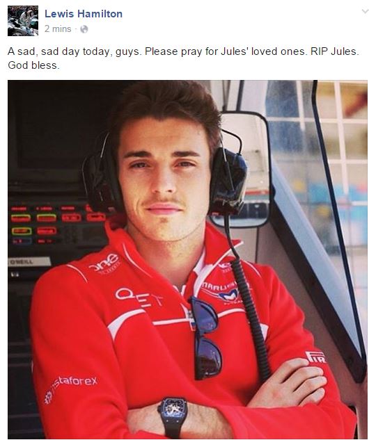 Ο Λιούις Χάμιλτον πόσταρε στον λογαριασμό του στο facebook τη φωτογραφία του πιλότου της F1 λέγοντας πως πρόκειται για μια πάρα πολύ θλιβερή ημέρα. “Αναπαύσου εν ειρήνη Ζιλ” έγραψε.