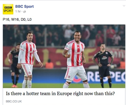 Ο Ολυμπιακός συνεχίζει το “απόλυτο” των νικών του στο ελληνικό πρωτάθλημα μετά και την επικράτηση του στη Νέα Σμύρνη με τον Πανιώνιο. Οι Πειραιώτες εντυπωσιάζουν με το σερί των 16 νικών στο πρωτάθλημα και πλέον έχει γίνει ευχάριστο θέμα και εκτός των συνόρων καθώς το βρετανικό BBC, θέτει το ερώτημα αν υπάρχει πιο καυτή ομάδα στην Ευρώπη αυτή την περίοδο» από τους «ερυθρολεύκους».