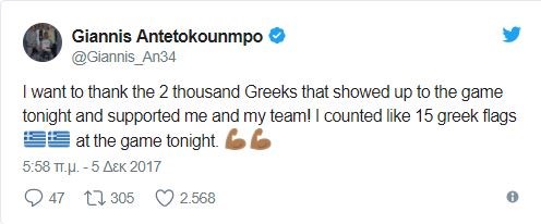 «Θέλω να ευχαριστήσω τους 2.000 Έλληνες που είδαν απόψε το παιχνίδι και υποστήριξαν εμένα και την ομάδα μου. Μέτρησα 15 ελληνικές σημαίες στο παιχνίδι», έγραψε στο προφίλ του στο Twitter o Έλληνας σταρ, πράγμα που επεσήμανε και στις δηλώσεις του μετά το τέλος της αναμέτρησης με τους Σέλτικς.