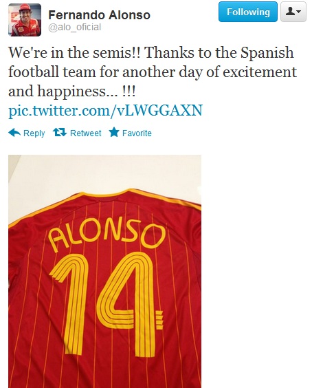 Σε πελάγη ευτυχίας έπλεε ο Φερνάντο Αλόνσο μετά την πρόκριση της Ισπανίας στα ημιτελικά του Euro. Ο πιλότος της Φεράρι ευχαρίστησε μέσω του Twitter τους παίκτες των «φούριας ρόχας» και έκανε μια ιδιαίτερη αφιέρωση σε έναν άλλον Αλόνσο, τον Τσάμπι, ο οποίος πέτυχε και τα δύο γκολ ενάντια στη Γαλλία.”Είμαστε στα ημιτελικά. Ευχαριστούμε την εθνική ομάδα της Ισπανίας για άλλη μια μέρα χαράς”.
