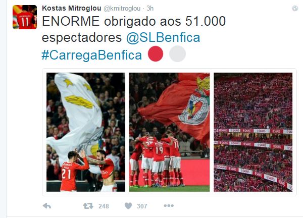 Ο διεθνής στράικερ, λοιπόν, μέσω  twitter έστειλε το «ευχαριστώ» του στους 51.000 οπαδούς της Μπενφίκα που βρέθηκαν στο γήπεδο.