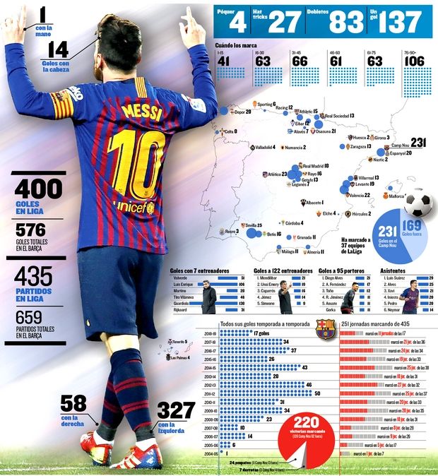 Πώς, όμως, προέκυψε αυτός ο μαγικός αριθμός; Η εφημερίδα “Mundo Deportivo” αποτύπωσε σ’ ένα εντυπωσιακό γράφημα τα 400 γκολ (137 μονά γκολ, 83 ματς με δύο γκολ, 27 χατ-τρικ και τέσσερα πόκερ (ματς με τέσσερα γκολ) του Αργεντινού σουπερστάρ σε 435 παιχνίδια (έχει σκοράρει σε 251 διαφορετικά ματς από τα συνολικά 435). Βέβαια, έχει πετύχει συνολικά 576 γκολ σε 659 αγώνες της Μπαρτσελόνα σε όλες τις διοργανώσεις.