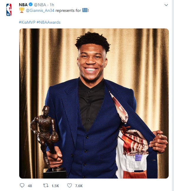 Ο Γιάννης Αντετοκούνμπο για την βράβευσή του ως πολυτιμότερος παίκτης του NBA, επέλεξε να βάλει ένα διαφορετικό σακάκι. Αν και στην πρώτη ματιά φαίνεται φυσιολογικό, στη φόδρα κρύβεται το μυστικό της αγάπης του προς την Ελλάδα, καθώς φαίνεται ο Παρθενώνας.