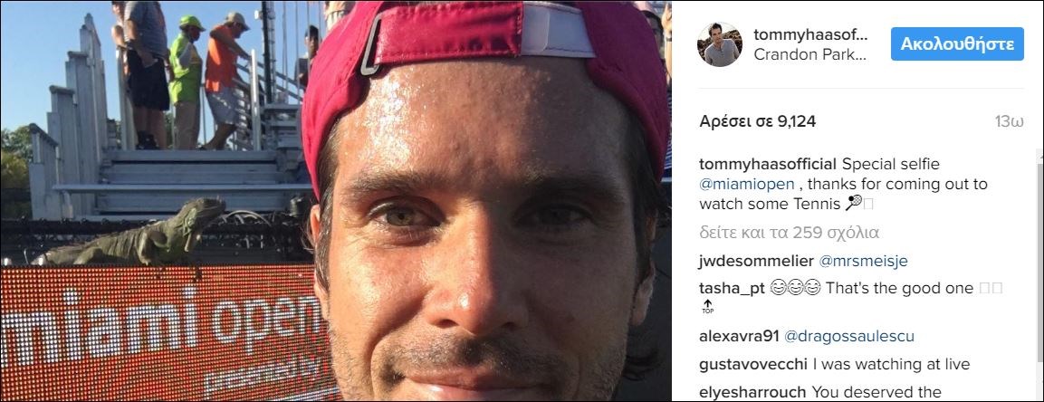 Ένας ασυνήθιστος επισκέπτης έκανε την εμφάνισή του σε παιχνίδι τένις για το Miami Open.Συγκεκριμένα, ο αγώνας ανάμεσα σε Τόμι Χάας και Γίρι Βέσελι, διεκόπη προσωρινά λόγω ενός ιγκουάνα!Οι δύο τενίστες αναμετρήθηκαν για το τουρνουά της Φλόριντα, με τον Βέσελι να επικρατεί με 6-7 (5), 6-3 και 7-5. Ωστόσο, ο αντίπαλός του δεν πτοήθηκε και αποχώρησε με… λάφυρο μια φοβερή φωτογραφία από το ματς.