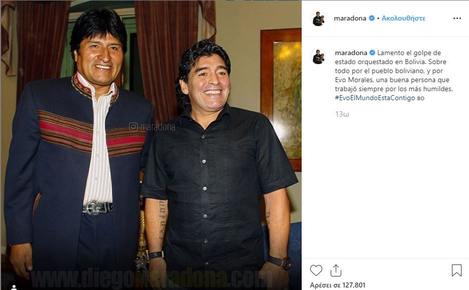 Ο Ντιέγκο Μαραντόνα εξέφρασε την υποστήριξή του στον Έβο Μοράλες, ο οποίος παραιτήθηκε από το προεδρικό αξίωμα, και κατήγγειλε το πραξικόπημα στη Βολιβία.