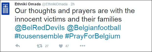 Η Εθνική Ομάδα εξέφρασε τη συμπαράστασή της απέναντι στην τραγωδία που έζησαν οι Βέλγοι πολίτες και με ανάρτησή της, στους προσωπικούς της λογαριασμούς, στα μέσα κοινωνικής δικτύωσης, επισήμανε πως οι σκέψεις και οι προσευχές των παικτών της βρίσκονται δίπλα στις οικογένειες που έζησαν τη φρίκη των βομβιστικών επιθέσεων.