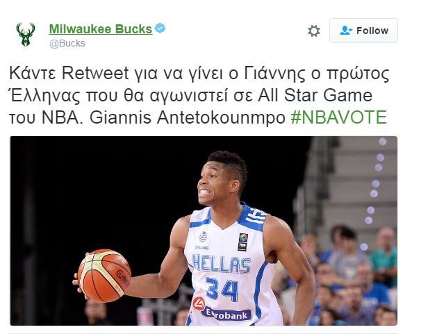 Συγκεκριμένα, έγραψαν στα ελληνικά: «Κάντε Retweet για να γίνει ο Γιάννης ο πρώτος Έλληνας που θα αγωνιστεί σε All Star Game του ΝΒΑ. Giannis Antetokounmpo #NBAVOTE».