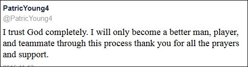 «Έχω απόλυτη εμπιστοσύνη στον Θεό. Θα γίνω καλύτερος άνθρωπος, παίκτης, συμπαίκτης μέσα από αυτή τη διαδικασία. Σας ευχαριστώ όλους για τις προσευχές και την υποστήριξη», ήταν το σχόλιο του Γιανγκ.