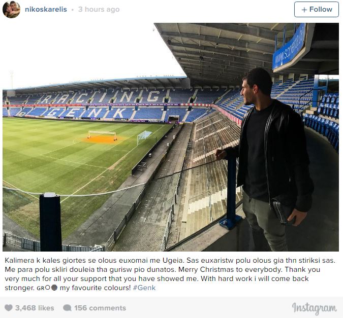 Ο 25χρονος Έλληνας επιθετικός της Γκενκ, που υπέστη ρήξη πρόσθιου χιαστού στο αριστερό του γόνατο και θα αναγκαστεί να μείνει εκτός γηπέδων τουλάχιστον για οκτώ μήνες, έγραψε στο Instagram: