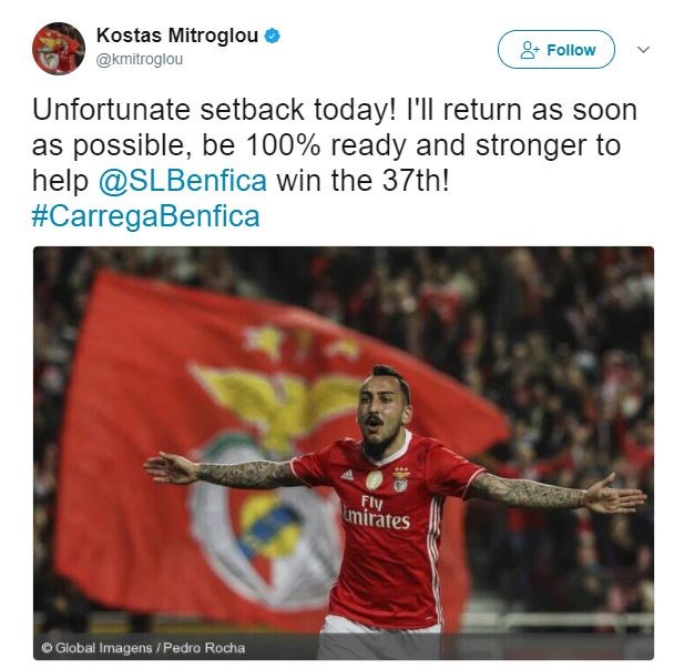 “Άτυχη στιγμή σήμερα! Θα επιστρέψω όσο το δυνατόν συντομότερα, 100% έτοιμος και πιο δυνατός προκειμένου να βοηθήσω την Μπενφίκα να κατακτήσει το 37ο πρωτάθλημα”, αναφέρει το μήνυμα του Έλληνα διεθνούς επιθετικού.