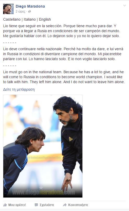 «Ο Λίο πρέπει να συνεχίσει στην εθνική ομάδα. Επειδή έχει να δώσει πολλά και θα πάει στη Ρωσία, ώστε να γίνει παγκόσμιος πρωταθλητής. Θα ήθελα να του μιλήσω. Τον άφησαν μόνο. Εγώ δεν θέλω να τον αφήσω μόνο του», έγραψε στο Facebook, ο Ντιέγκο Μαραντόνα, εκφράζοντας με αυτό τον τρόπο τη στήριξη και τη συμπαράστασή του στον Λιονέλ Μέσι.