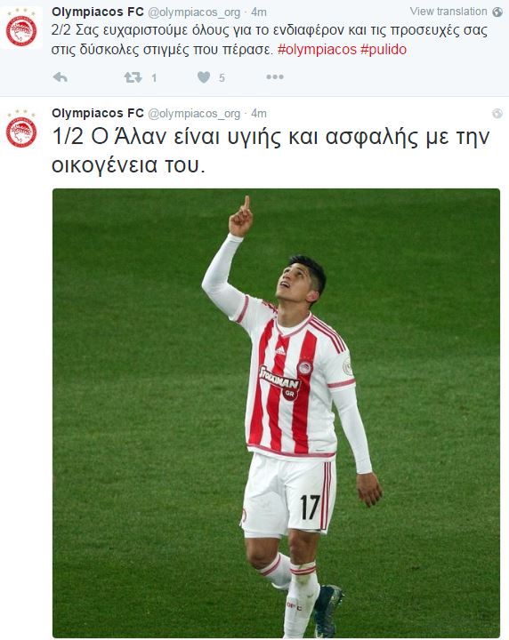 «Ο Άλαν είναι υγιής και ασφαλής με την οικογένεια του. Σας ευχαριστούμε όλους για το ενδιαφέρον και τις προσευχές σας στις δύσκολες στιγμές που πέρασε. #olympiacos #pulido», ήταν το μήνυμα στον επίσημο λογαριασμό της ομάδας στο twitter.