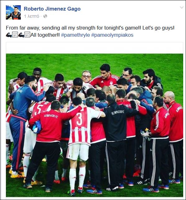 «Από μακριά, στέλνω όλη μου τη δύναμη για το αποψινό παιχνίδι. Πάμε παιδιά. Όλοι μαζί. Πάμε θρύλε. Πάμε Ολυμπιακός», έγραψε ο Ρομπέρτο, ενώ ανέβασε και μια φωτογραφία από παλαιότερο παιχνίδι των Πειραιωτών.