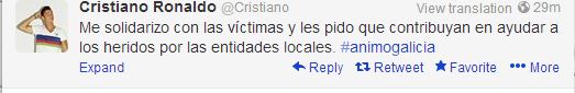 Ο Πορτογάλος ποδοσφαιριστής της Ρεάλ Μαδρίτης, Κριστιάνο Ρονάλντο, εξέφρασε τα συλλυπητήρια του για την τραγωδία που συνέβη στην ισπανική Γαλικία, μέσω twitter.