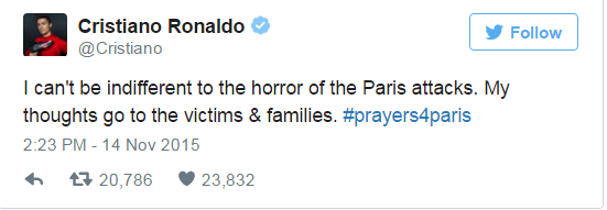 Το αστέρι της Ρεάλ Μαδρίτης Κριστιάνο Ρονάλντο θέλοντας να εκδηλώσει με το δικό του τρόπο την συμπαράστασή του στις οικογένειες των αδικοχαμένων θυμάτων, αλλά και γενικότερα την υποστήριξη του προς στον γαλλικό λαό, σε αυτές τις δύσκολες στιγμές που διανύει, έστειλε το δικό του μήνυμα μέσω των κοινωνικών μέσων δικτύωσης.