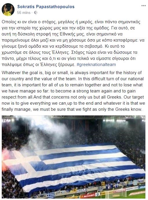 «Όποιος κι αν είναι ο στόχος, μεγάλος ή μικρός, είναι πάντα σημαντικός για την ιστορία της χώρας μας και την αξία της ομάδας. Για αυτό, σε αυτή τη δύσκολη στροφή της Εθνικής μας, είναι σημαντικό να παραμείνουμε όλοι μαζί και να μη χάσουμε όσα με κόπο καταφέραμε: να γίνουμε ξανά ομάδα και να κερδίσουμε το σεβασμό. Κι αυτό το χρωστάμε σε όλους τους Έλληνες.