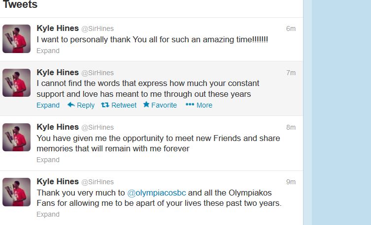 Πριν από λίγο ο Κάιλ Χάινς ευχαρίστησε μέσω του Twitter την διοίκηση του Ολυμπιακού, αλλά και τους οπαδούς για τις στιγμές που έζησε τα δύο τελευταία χρόνια στον Πειραιά.