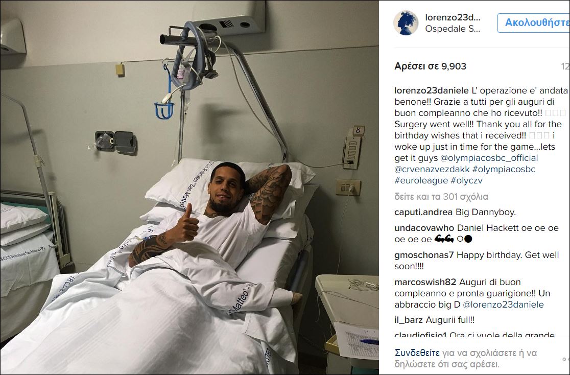 Ο διεθνής Ιταλός δημοσίευσε φωτογραφία, γράφοντας ότι: «Το χειρουργείο πήγε καλά! Σας ευχαριστώ όλους για τις ευχές που πήρα! Ξύπνησα ακριβώς την ώρα του αγώνα (σ.σ. Ολυμπιακός-Ερυθρός Αστέρας). Πάμε για τη νίκη, παιδιά».