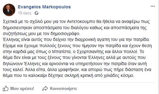 “Σχετικά με το σχόλιό μου για τον Αντετοκούνμπο, θα ήθελα να αναφέρω πως δημοσιεύτηκαν αποσπάσματα του διαλόγου, καθώς και αποσπάσματα της συζητήσεως μου με τον δημοσιογράφο.