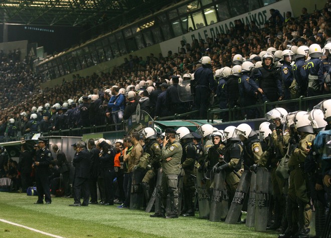 Το ότι η αστυνομική δύναμη στο παιχνίδι του Παναθηναϊκού με τον Ολυμπιακό θα ήταν κάτι παραπάνω από ενισχυμένη, λίγο πολύ το ξέραμε όλοι. Ωστόσο κανείς δεν περίμενε να δει διπλούς και τριπλούς προστατευτικούς τοίχους από κράνη, ασπίδες και κλομπ. Όποιος έχει υπομονή ας κάτσει να μετρήσει στη συγκεκριμένη φωτογραφία πόσοι αστυνομικοί υπάρχουν, γιατί εμείς χάσαμε το μέτρημα.