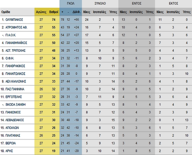Διαβάστε αναλυτικά τα αποτελέσματα της 27ης αγωνιστικής, δείτε τη βαθμολογία και τα στατιστικά, καθώς και το πρόγραμμα της επόμενης αγωνιστικής.