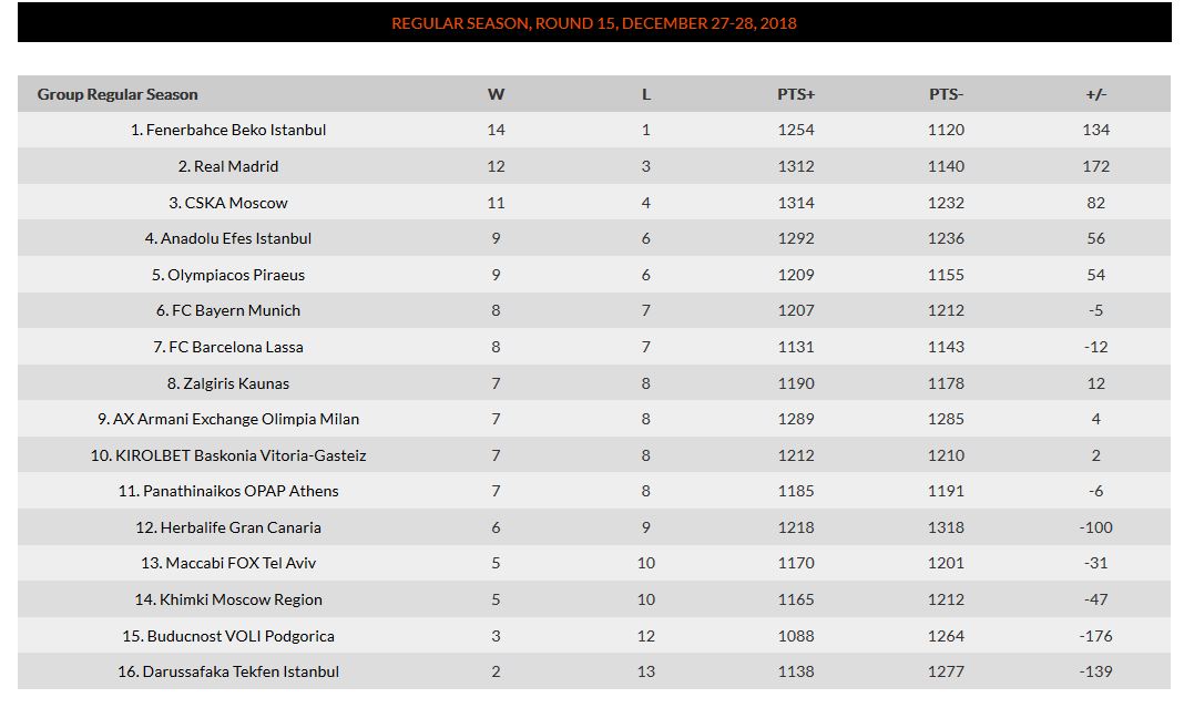 Η Φενέρμπαχτσε, από την άλλη, έκρυψε την απουσία του εμπύρετου Κώστα Σλούκα, εκμεταλλεύθηκε την αποβολή του Σέρχιο Γιουλ (αντιαθλητικό φάουλ και τεχνική ποινή) και με μεγάλο καλάθι του Ντατόμε επιβλήθηκε στα σημεία της Ρεάλ Μαδρίτης (65-63) για να μείνει μόνη στην κορυφή της κατάταξης και να κάνει τεράστιο βήμα για την κατάκτηση της πρώτης θέσης.